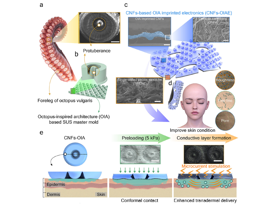 본 연구는 문어의 빨판 구조를 모방한 셀룰로오스 나노섬유(CNFs) 기반의 전자 패치를 개발했습니다. 이 패치는 피부에 효과적으로 밀착하여 경피 약물 전달 효율을 높이고, 마이크로 전류를 발생시켜 피부 상태를 개선하는 데 도움을 줍니다.