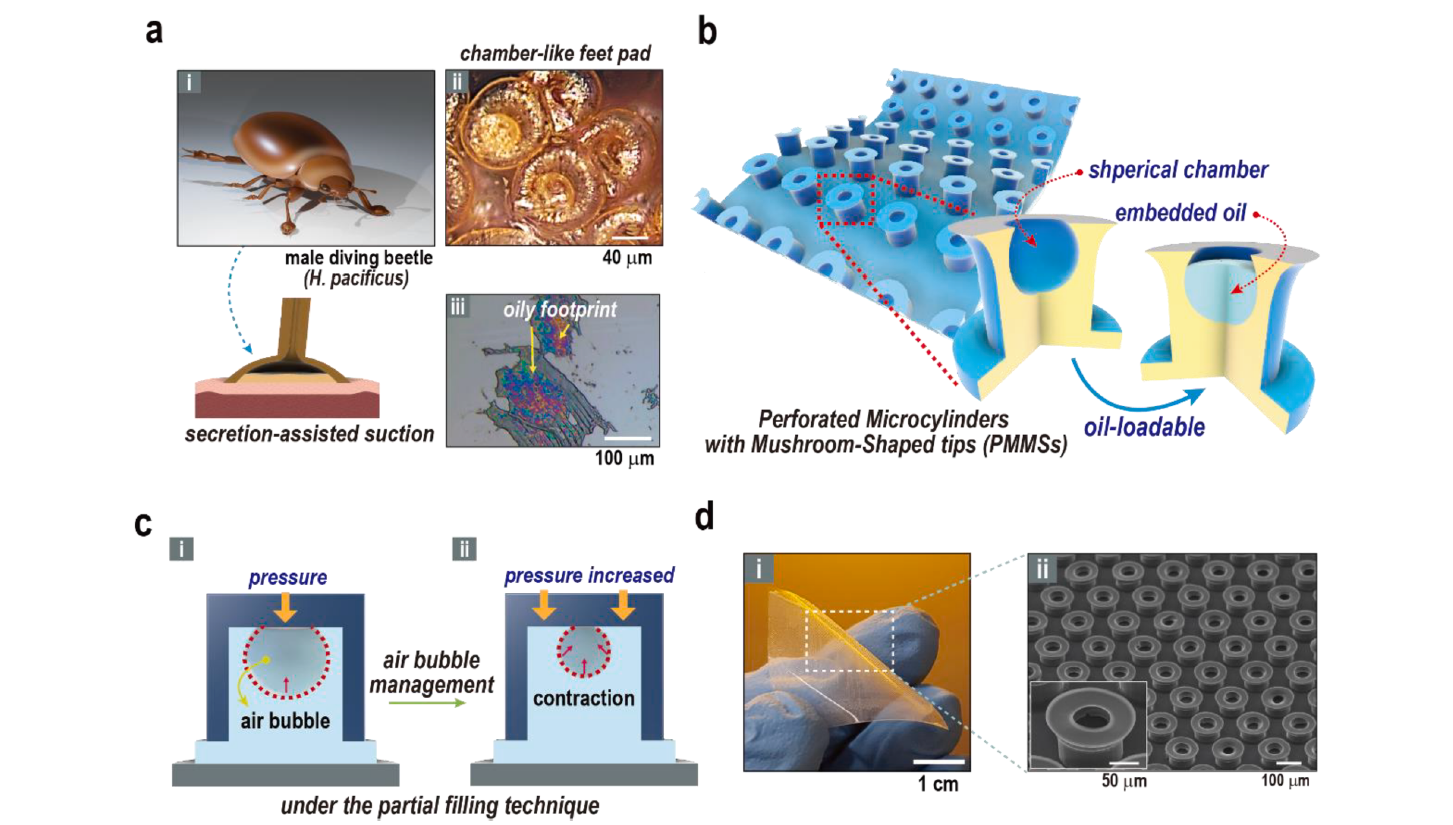 이 연구는 딱정벌레의 발 구조를 모방한 천공형 마이크로 실린더(PMMCs)를 개발하여 습하거나 젖은 환경에서도 높은 접착력을 유지하는 기술을 소개합니다. 기존의 건조 접착 기술과 달리, 이 패치는 유성 액체를 사용하여 피부 표면의 수분과 기름을 흡수함으로써 강력하고 안정적인 부착력을 제공하며, 특히 외과 수술용 기기나 웨어러블 장치에 적용될 수 있는 잠재력을 보여줍니다.